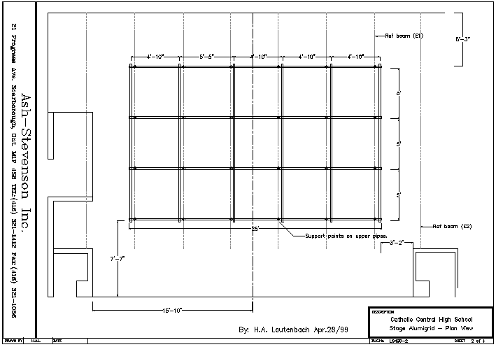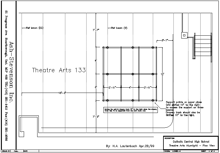 | Cafeteria side Stage and Lecture Threatre & Drama teaching side This utilizes and upper lighting grid for mounting all hardware at an elevation of 16 feet. Would have like to see the grid at about 14 Ft. 6 inches for it would have been more ideal for 500 watt fixtures. To be compleated summer of 2002 |